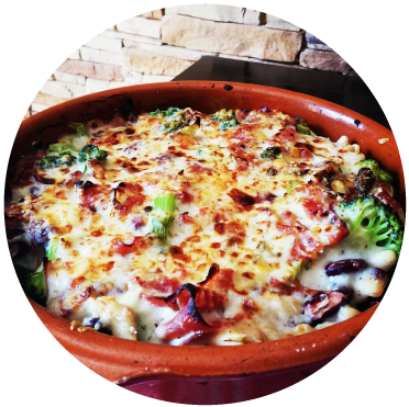 Ponemos en el recipiente las alubias rojas y blancas. Añadimos el brócoli y la bechamel con el jamón serrano.