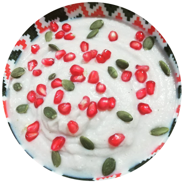 Crema de coliflor y almendras con topping de granada y pipas de calabaza