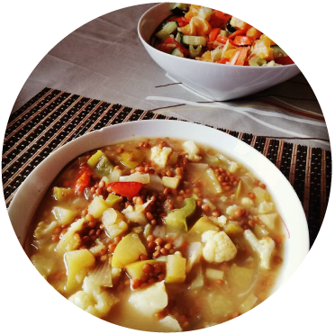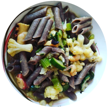 Caldo de pescado Verduras al gusto (coliflor, apio, calabacin) Gambitas y pulpo Macarrones de trigo sarraceno Salteamos las verduras con las gambas y el pulpo. Cocemos los macarrones en el caldo de pescado y añadimos el salteado.