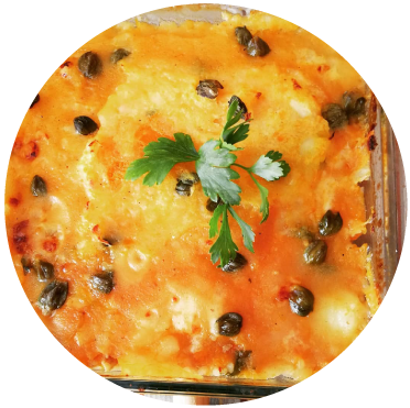 Bacalao Salsa: 1 cebolla, 2 naranjas y un puñado de pasas. Gara masala al gustoPochar la cebolla a fuego lento y triturar con las naranjas.Pimiento rojo de guarnición.Al horno y listo!
